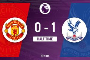 上半场伤停补时3分钟,半场结束,曼联暂0-1水晶宫。